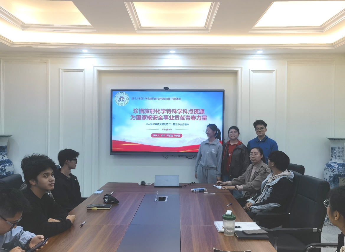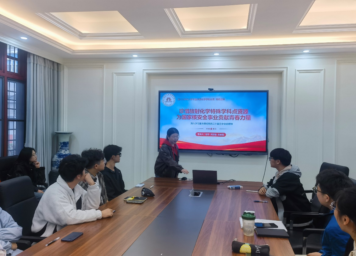 随后,赵宁同学介绍了我校放射化学学科的发展史,揭示了放射化学对于核安全事业的重要性。同时,以学院教师科研团队为代表,体现了我院在放射化学学科发展进程中做出的重要贡献,鼓励新时代青年积极响应党和国家的号召,把握好高校平台,认真学习专业知识,肩负起维护核安全的使命,保障核事业安全、健康、可续发展。