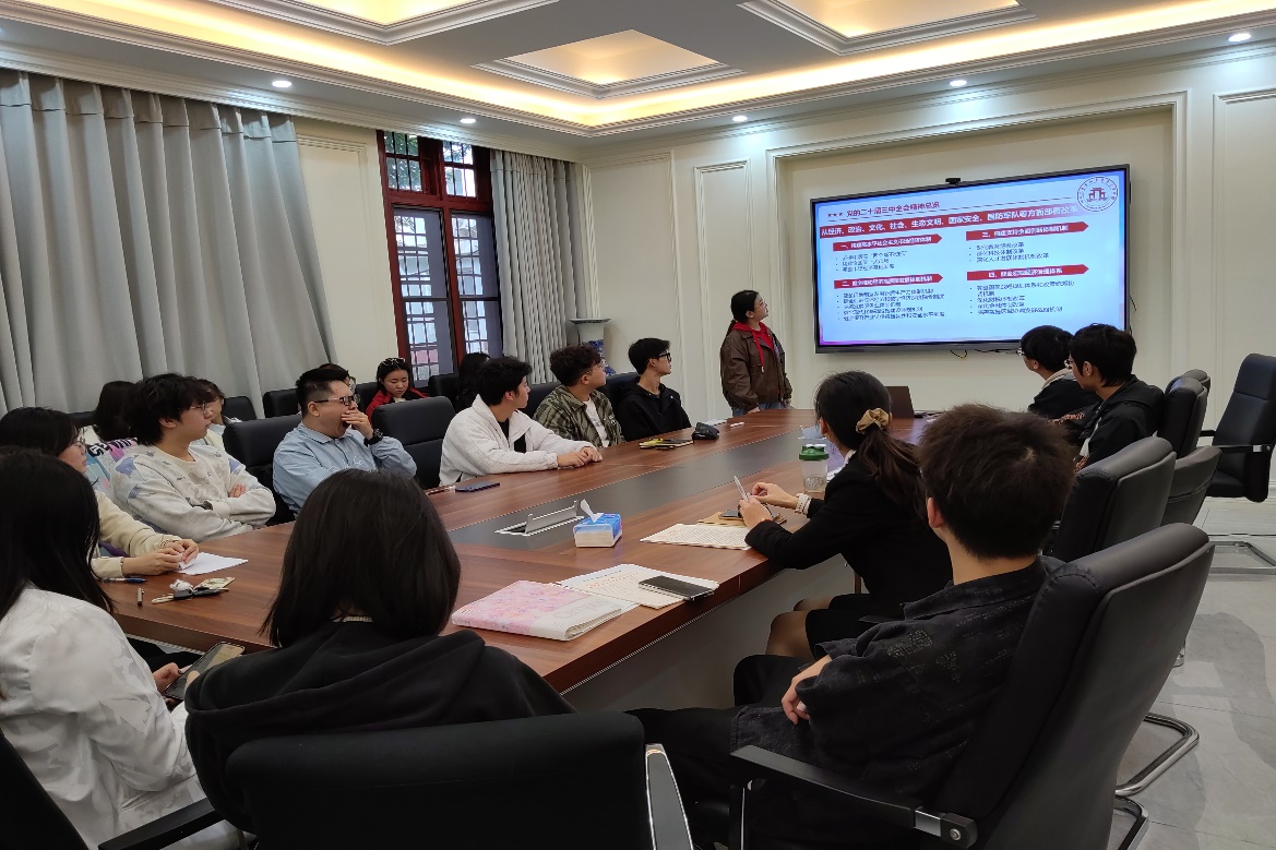 赵宁同学首先介绍了党的第二十届三中全会内容,并引导同学们探究其背后的精神内涵,感受党和国家对人民呼声、人民需求的深切关怀,了解党和国家为实现人民日益增长的美好生活需要所做的巨大努力。
