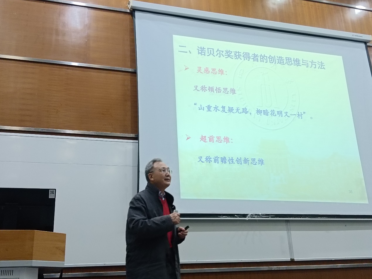 首先,胡常伟老师从诺贝尔奖讲起,讲述诺贝尔奖的背景,阐述了诺贝尔奖主要着重基础理论研究,其对世界科学技术进步、文化繁荣、人类和平做出了无法估量的贡献。让同学们对诺贝尔奖有了清晰的认识。 接下来,胡老师从诺贝尔奖引入创新思维,阐述了创新的意义,由众多诺贝尔奖案例剖析诺贝尔奖得主具备的创造思维、创新思维、质疑思维、求异思维、直觉思维、想象思维、灵感思维、超前思维这七种思维方式。