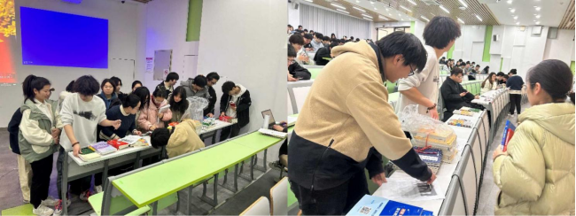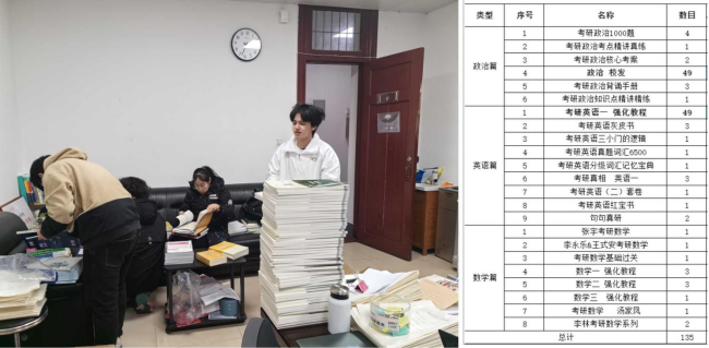 2023年12月29日下午, 2021级本科年级在基础教学楼C201教室组织书籍发放,根据预约情况领取相应的考研材料。发放现场气氛热烈,领取到书籍的21级同学表示会充分利用好这些书籍,认真备考。