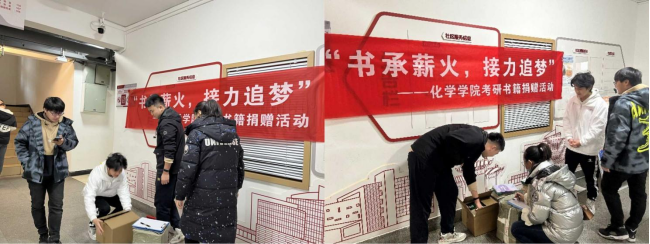 2023年12月底,2024届考研初试结束后,为加强我院本科高年级学风建设,更好地利用考研书籍及资料,让其继续发挥余热,化学学院2020本科年级联合2021本科年级,组织开展“书承薪火,接力追梦”——化学学院考研书籍捐赠活动,助力2021级考研同学接力追梦。