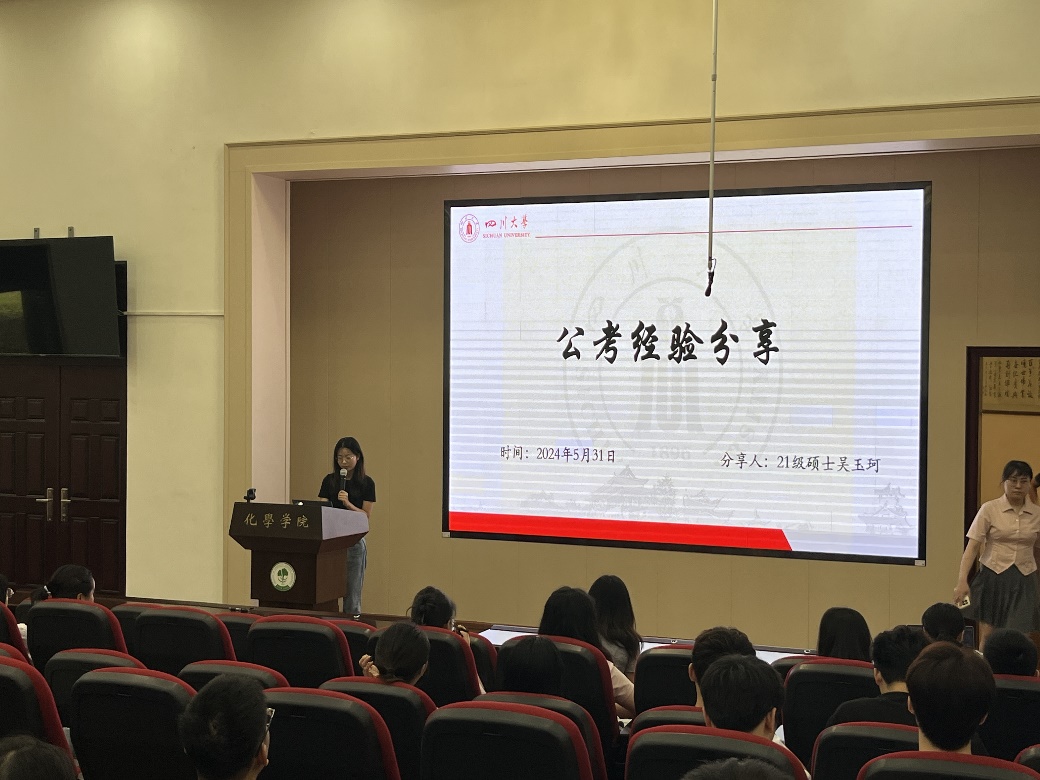 2024年5月31日上午, 化学学院举行2024届毕业研究生就业分享交流会,2022级研究生同学参加了此次交流会。杜晓燕老师简要介绍了近年来学院研究生的就业情况,请同学们合理调整心理预期,沉下心来认真思考,以正确的心态、全面的考量选择自己理想中的工作岗位。