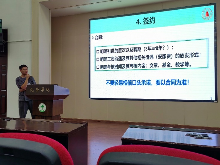 最后,2021级博士研究生肖园分享了他在寻找教职过程中的体会,结合自己的亲身经历强调了前期工作的准备以及求职过程中需要着重甄别的“陷阱”。