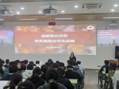 为做好同学们就业指导工作,引导学生明晰当前就业形势、了解就业政策、树立正确的就业观念,化学学院党委书记谢均老师于2025年3月28日晚在望江校区基础教学楼C204教室为同学们带来题为“当前就业形势与实施就业优先战略”的专题讲座。