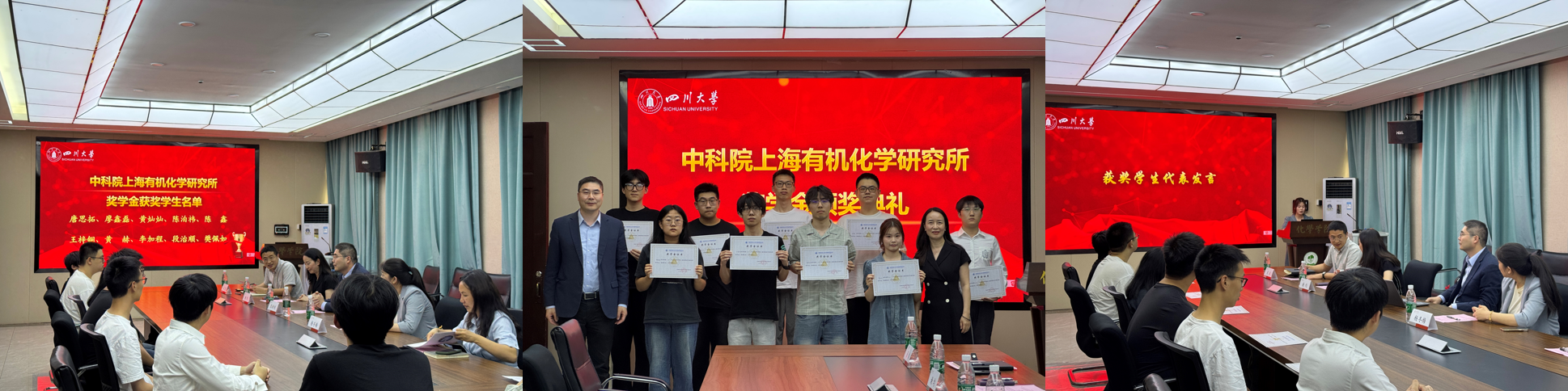 在热烈的掌声中,杨冬梅老师宣布获奖学生名单,到会嘉宾为获得2024年度“中科院上海有机化学研究所奖学金”的10名同学颁奖。