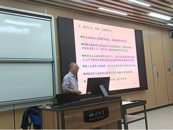 胡常伟教授以其深厚的学术造诣和丰富的科研经验,从诺贝尔奖的历史与科学精神切入,为同学们系统梳理了这一世界顶级奖项的创立背景与发展历程。诺贝尔奖的设立源于对人类科技与文化进步的崇高追求,代表着科学创新的最高荣誉与社会责任。在谈到科研创新与时代发展的关系时,胡常伟教授强调,创新是一个国家综合实力的重要体现,是推动社会可持续发展的核心动力。 他勉励同学们应打破固有思维模式,勇于质疑、敢于探索,在科研学习中培养独立思考与合作精神,用科学的理性与青年人的热情共同开创未来。
