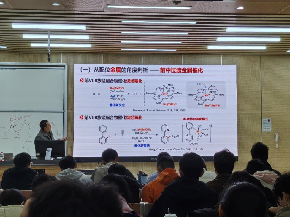 曾老师以金属价态的多样性与创新潜力为核心,引导同学们跳出思维定式。他举例说明,从常见的一价铑催化拓展到零价铑催化,生动揭示了通过改变金属价态、配体设计、金属粒子数量与联合形式等要素,存在着广阔的创新空间。他鼓励同学们在化学领域应大胆探索,不要因暂时的困难(如化学污染问题)而束缚创新的脚步。