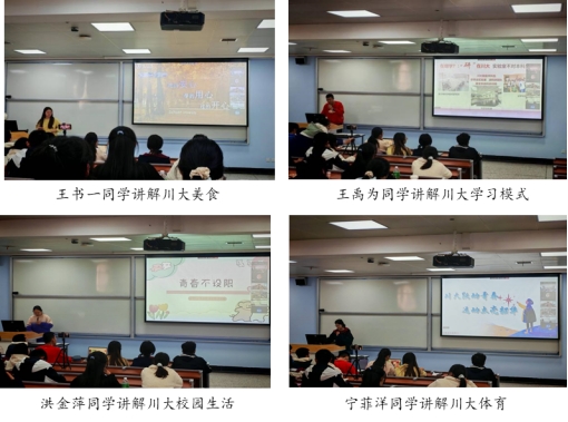 第二篇章 “大学生活 —— 大学怎么过?” 从多个维度为中学学子描绘大学日常。王书一同学带来 “舌尖上的川大” 分享,校园食堂美食与周边特色小吃的展示,传递出川大校园 “吃得放心” 的归属感;王禹为同学以 “学霸修炼手册” 为主题,对比中学与大学学习模式,详解小班研讨、创新创业项目、跨学科选课等特色学习形式,强调大学学习的 “自主性”;洪金萍同学分享 “青春不设限” 的成长故事,社团招新、志愿服务、国际交流、学术竞赛等经历,展现出川大 “乐得实在” 的广阔成长空间;宁菲洋同学则聚焦 “运动正当时”,通过体育馆、操场的实景展示,以及篮球赛、足球赛、夜跑等体育活动的呈现,诠释了 “身体好才能走得远” 的健康理念。