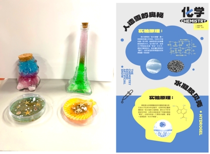 此次互动体验包含两个项目,第一个项目是利用安全无毒的吸水树脂与色素在形状各异的玻璃瓶内制作蓬松多彩的“人造雪”。吸水树脂是一种网状高分子材料,当水倒入树脂时,其分子网格中可迅速捕获水分子,从而可以吸收比自身重百倍的水分,使自己膨胀变大,变成蓬松柔软的“雪花”。第二个项目是利用明胶与沙子、贝壳制作漂亮的水凝胶贝壳。明胶分子在热水中会溶解,冷却时则会重新缠绕成一张缠绕成一张立体的三维网络,将水分子牢牢地锁在中间,从而形成漂亮的固体水凝胶。