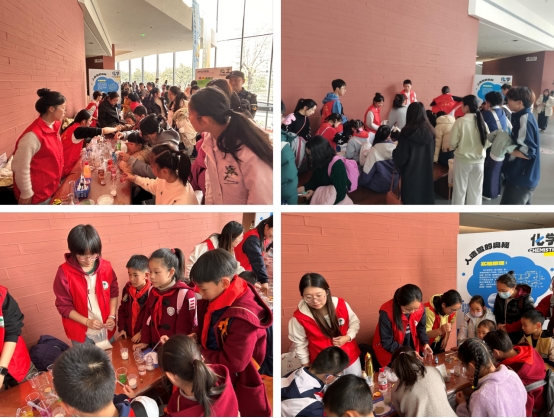 下午2点,体验活动正式开始,来自英国上市公司365附属实验小学及成都市其他部分学校的同学有序排队在摊位前体验,化学学院的志愿者耐心地为小朋友讲解实验原理,引导其有序开展动手实践并辅助加入吸水树脂、配置明胶。活动期间氛围融洽,小朋友们不仅完成了漂亮的“人造雪”瓶子和水凝胶贝壳,同时也收获了丰富的化学知识,两天的活动累计体验800余人次,活动受到了小朋友和家长的一致好评。