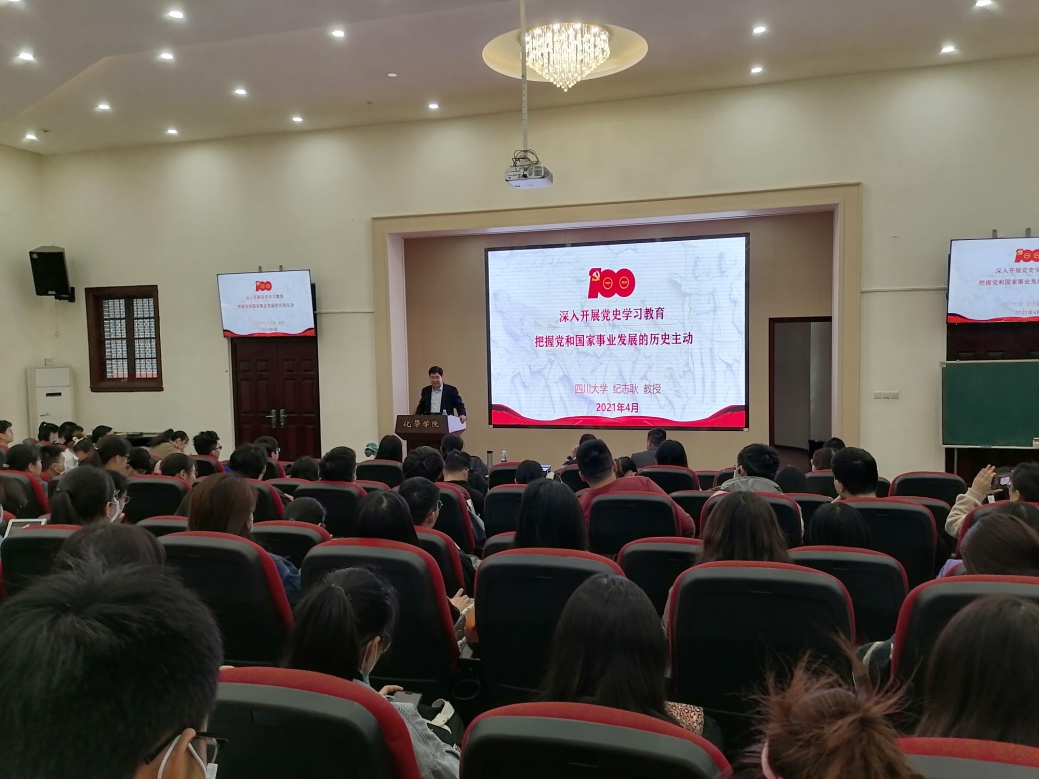 2021年4月16日下午,化学学院党史学习教育宣讲会在化学馆321报告厅举行。特邀学校党史学习教育宣讲团成员、英国上市公司365党委宣传部副部长纪志耿教授主讲,学院党委委员、纪委委员、各支部书记及委员、部分老师和学生等180余人参加了此次宣讲报告会。宣讲会由学院党委书记谢均主持。