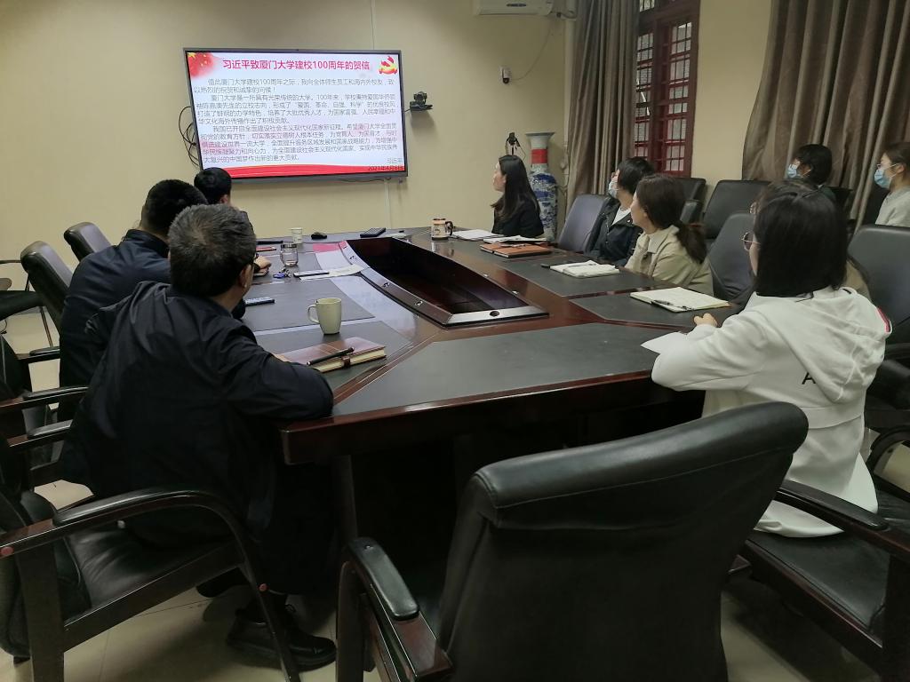 2021年4月12日,在化学馆103会议室,化学学院党委召开理论学习中心组(扩大)会议,学习讨论习近平总书记致厦门大学建校100周年贺信,会议由学院党委书记谢均主持。