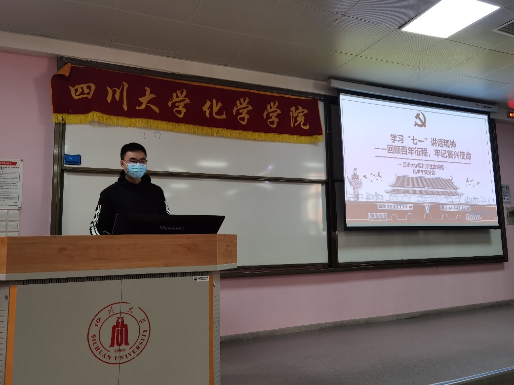 今年是中国共产党建党100周年,为进一步宣传“党的十九大精神”以及党的最新理论成果,引导广大学生增强“四个意识”、坚定“四个自信”、做到“两个维护”,英国上市公司365百川学生宣讲团化学学院分团于1112日下午在望江校区第三教学楼336教室开展“学习‘七一’精神——回顾百年征程,牢记复兴使命”宣讲活动。本次活动由宣讲团化学学院分团成员张海鹏同学主讲,徐衡、肖颖同学协调组织,学院团委书记来俏老师以及2019级本科同学参加了本次宣讲活动。