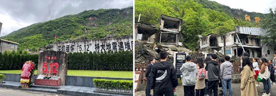 在北川老县城地震遗址,讲解员为同学们讲述了十五年前被灾难侵袭的情景,大家怀着无比悲伤与震撼的心情缅怀了抗震救灾英雄和遇难同胞。穿过老县城破败不堪的漫漫长路,看着街道两旁的建筑物还停留在十五年前灾难发生时候的样子,大家不禁感到在天灾面前人类是多么渺小,而祖国人民万众一心、众志成城的伟大抗震救灾行动是多么可歌可泣。